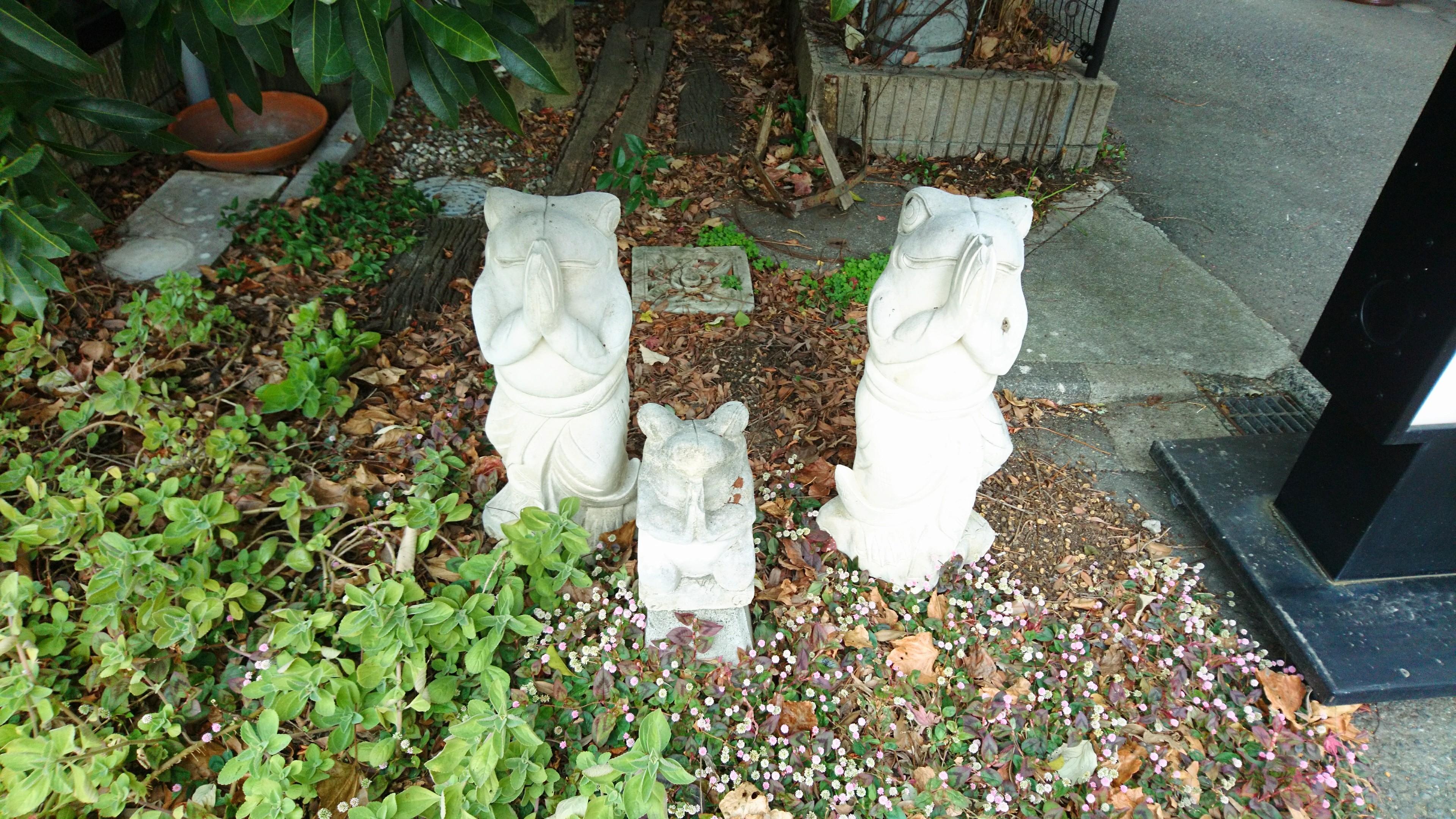 当オフィスのマンションの前にあるカエルのオブジェ。三匹そろって祈りを捧げているようです。早く平穏な世の中に戻りますように。