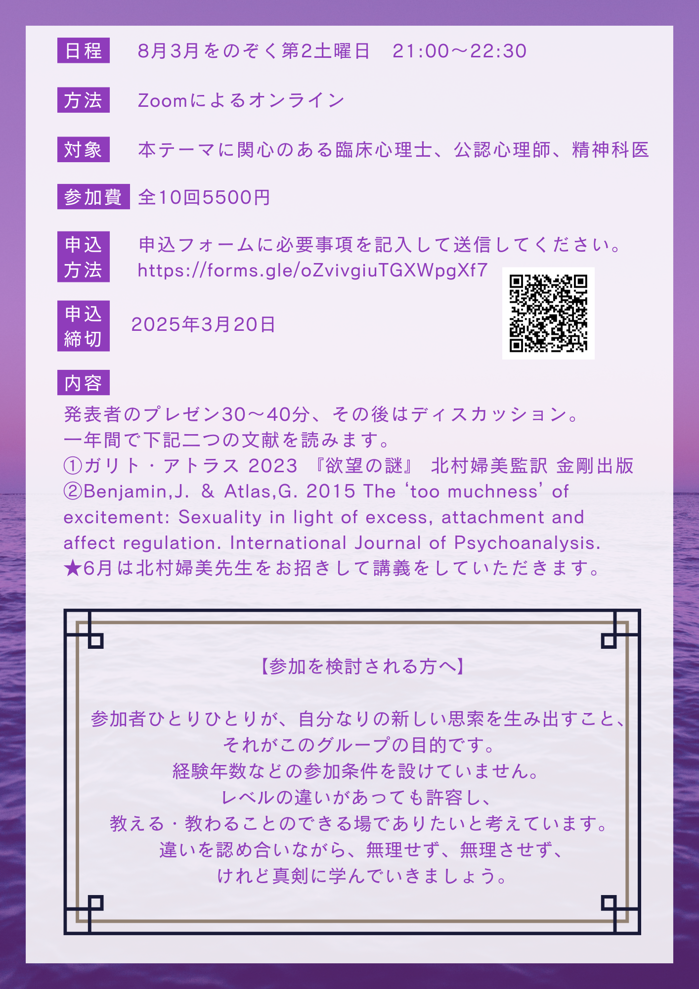 本テーマに関⼼のある臨床心理士、公認心理師、精神科医 【参加費】 年間5500円(全10回)