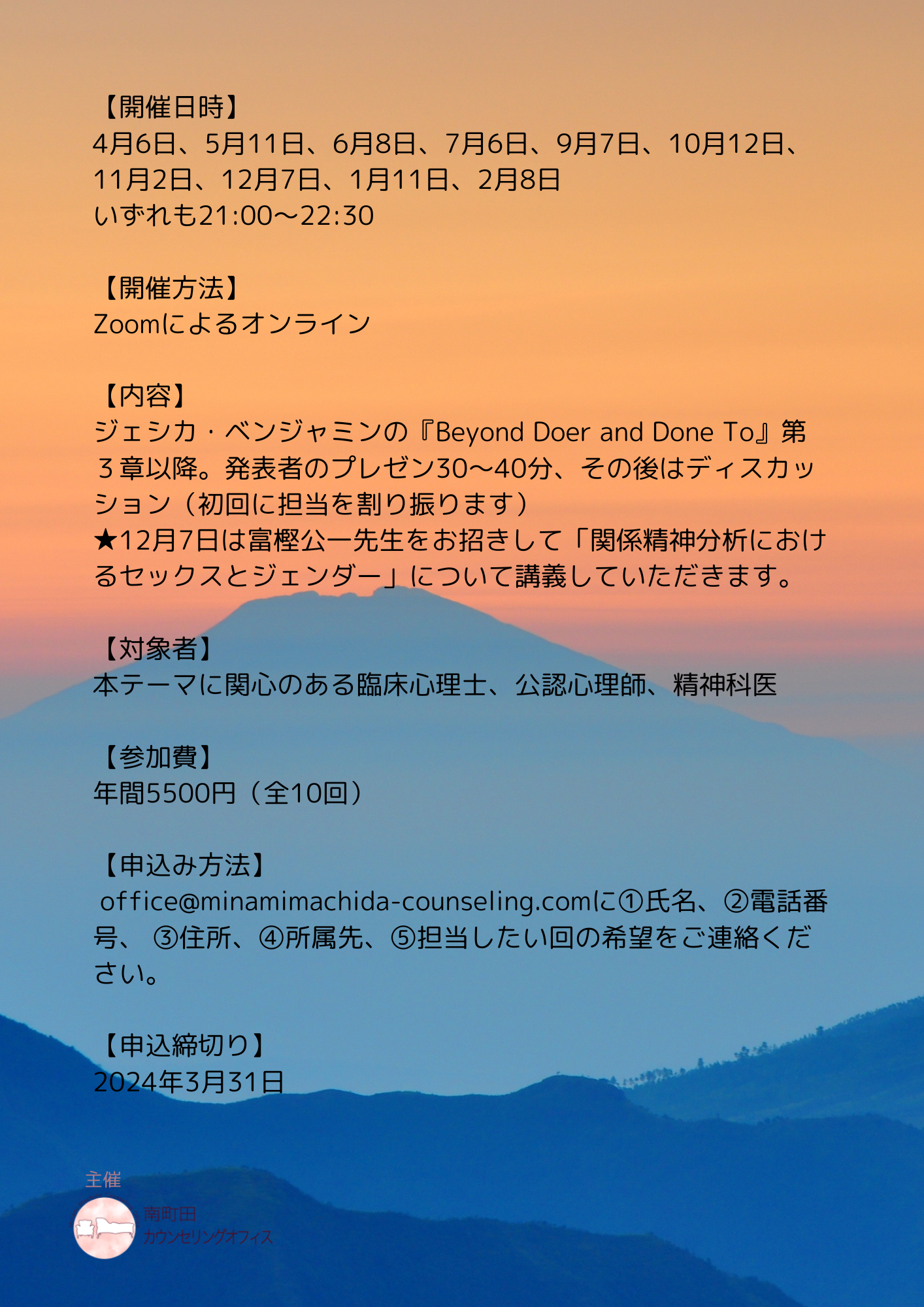 申込み⽅法: office@minamimachida-counseling.comに①⽒名、②電話番号、 ③住所、④所属先、⑤担当したい回の希望をご連絡ください。